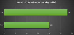 Het merendeel van jullie denkt dat FC Dordrecht de play-offs gaat halen, als zijn de meningen hierover verdeeld. Hangt natuurlijk ook wel samen met de plaats op de ranglijst….