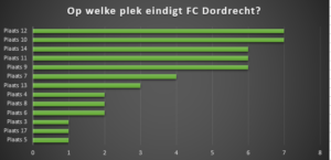 Over waar FC Dordrecht gaat eindigen op de ranglijst lijken jullie het redelijk met elkaar eens te zijn, een plek in de middenmoot (plek 9 tot en met 14) wordt het vaakst genoemd. Er is helemaal niemand die Dordt het kampioenschap toedicht, maar gelukkig de laatste plaats ook niet!