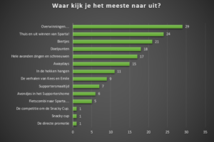 Jullie konden vrijuit klikken in dit lijstje en dat hebben jullie gedaan. Iemand kijkt uit naar de directe promotie, zonder dat wij kampioen worden. Zou het dan weer een beloftenelftal worden die kampioen wordt? Zo te zien hebben wij ook al vijf gegadigden voor de fietscombi naar Sparta zijn de meeste van jullie gewoon blij met een overwinning, bij voorkeur tegen Sparta.