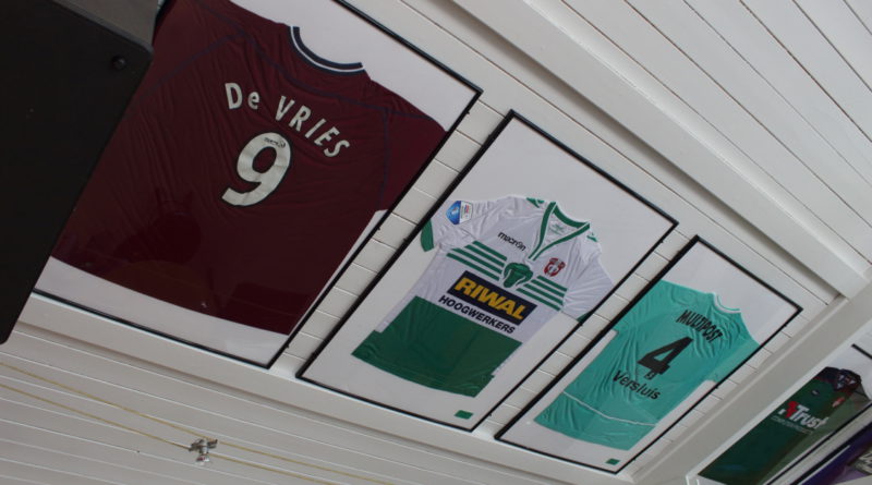 In het Supportershome hangen al jaren gedragen wedstrijdshirtjes aan het plafond. Om deze beter te beschermen, zijn de shirts ingelijst